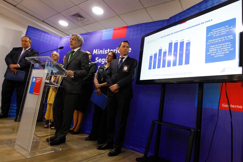 Junto al Fiscal Nacional, Ángel Valencia, y a la subsecretaria de Prevención del Delito, Carolina Leitao, el titular de Seguridad señaló que durante 2025 se registraron 1.091 víctimas de homicidio consumado, 118 casos menos que en 2024. Esta cifra representa una disminución del 11,5% en la tasa por cada 100 mil habitantes.