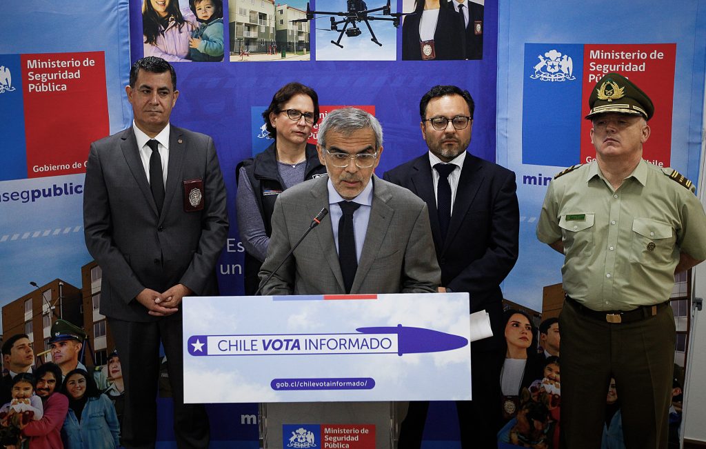 El ministro de Seguridad Pública, Luis Cordero, junto al general director de Carabineros, Marcelo Araya; el subdirector de Investigación Policial de la Policía de Investigaciones, prefecto general Hugo Haeger; y los subsecretarios de Seguridad Pública y de Prevención del Delito, Rafael Collado y Carolina Leitao, informaron sobre el dispositivo de seguridad que se desplegará durante la jornada electoral de este domingo 16 de noviembre con motivo de las elecciones presidenciales y parlamentarias.